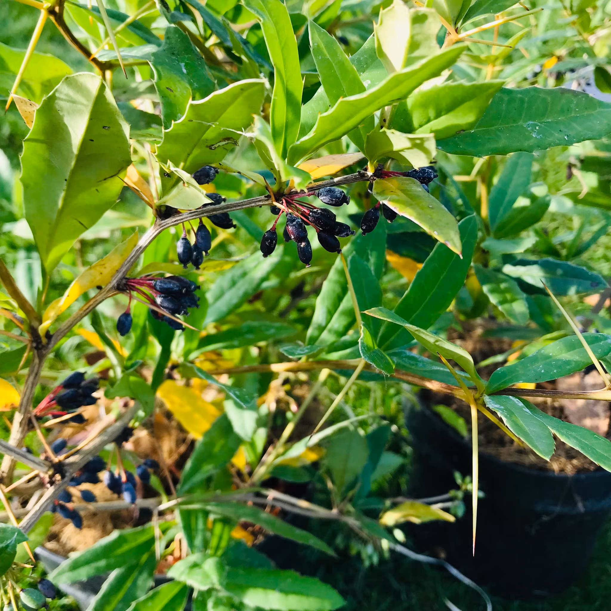 Bredbladig vintergrön, taggig buske. Blommar med fylligt gula blommor i klasar Följs av blåa bär som är ätliga. Trivs i väldränerad, näringsrik, lerhaltig jord i soligt eller halv skuggigt läge.