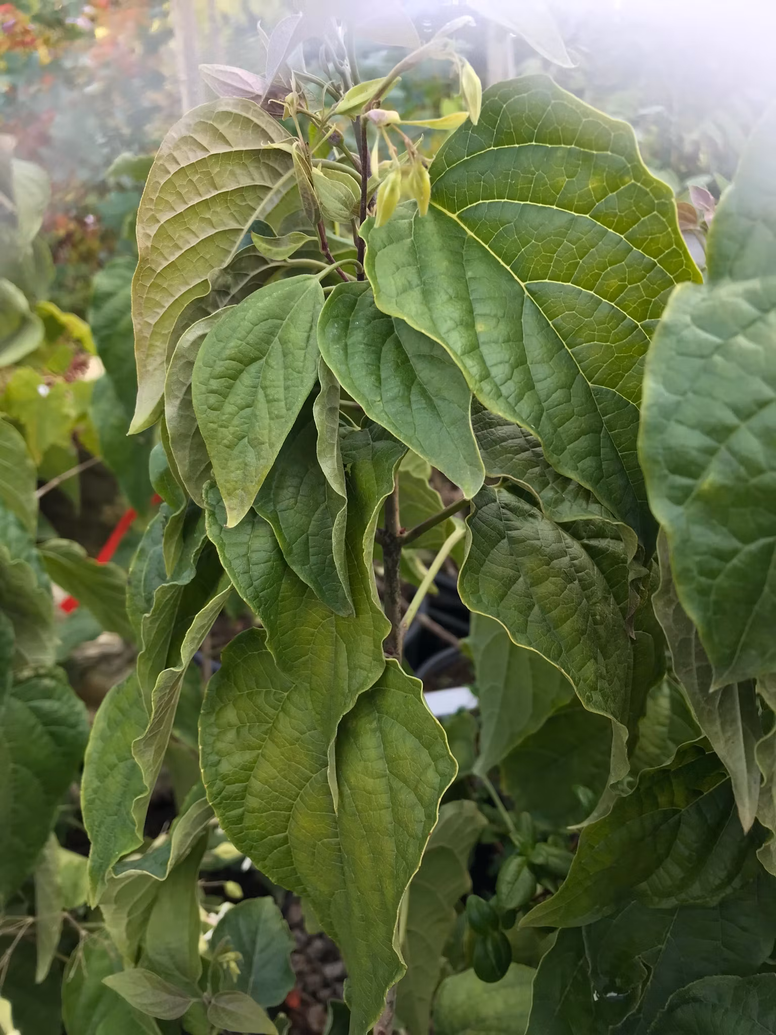 Liten , lövfällande buske eller träd med hjärtformade blad.Blommar på sen sommaren med vita blommor som följs av spektakulära blå frukter med stora röda foderblad i klasar. Kan även odlas i krukor. Trivs i väldränerad jord utan större krav i soligt till halv skuggigt läge.