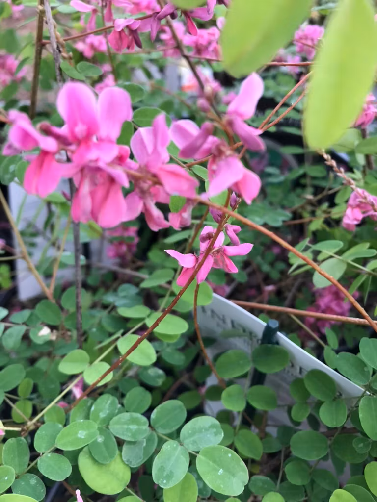 Blommar med små, ärtliknande, lila blommor i smala klasar, 7–23 cm långa. Blomningsperiod från juni till sensommar eller tidig höst om det är soligt och varmt.