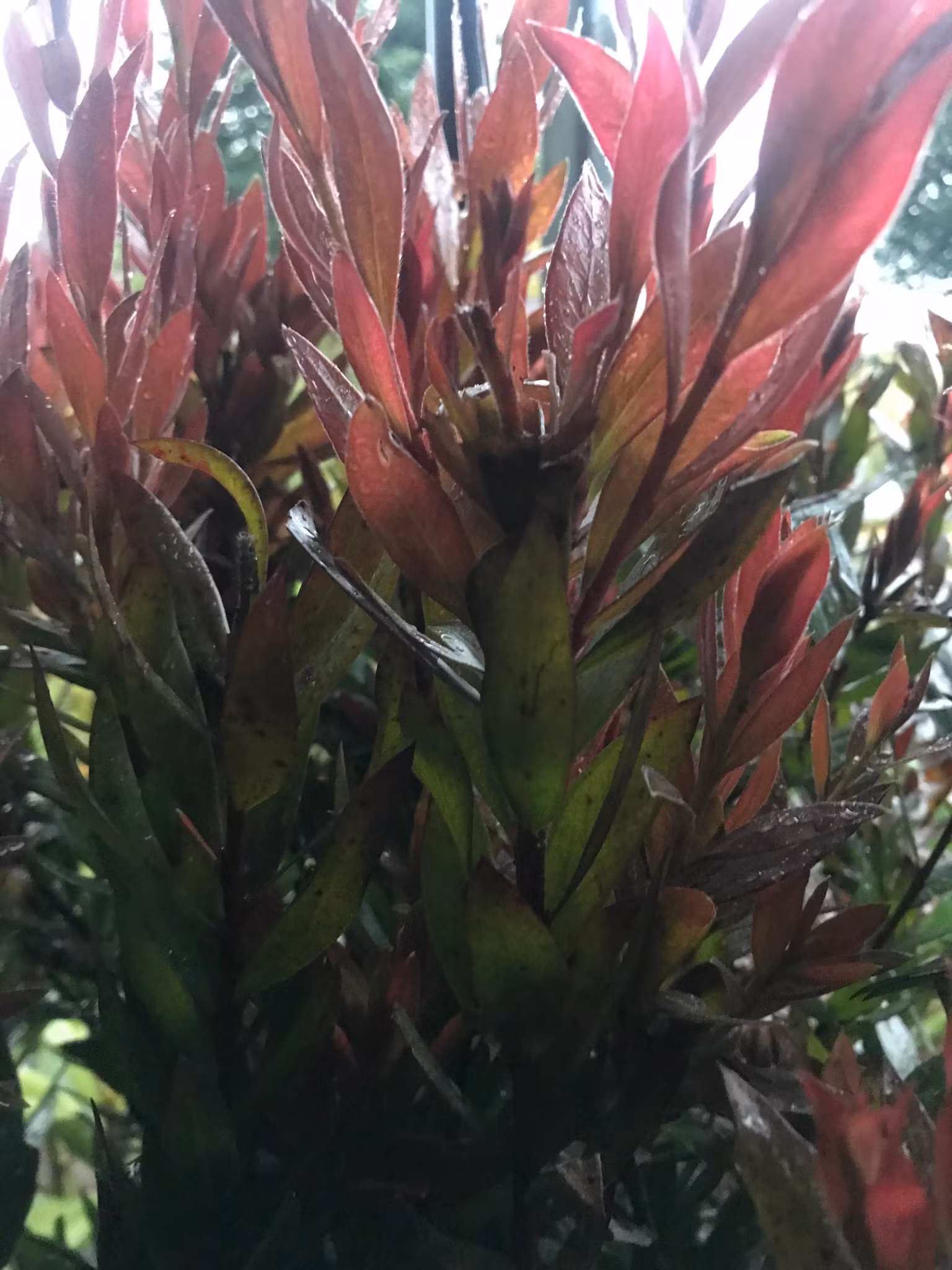 Kompakt exotisk vintergrön buske med aromatiska blad. Klarröda unga skott skapar en magnifik kontrasr med det mogna mörkgröna bladverket. Blommar med röda borstliknande blommor. Sluthöjd 1,5m .