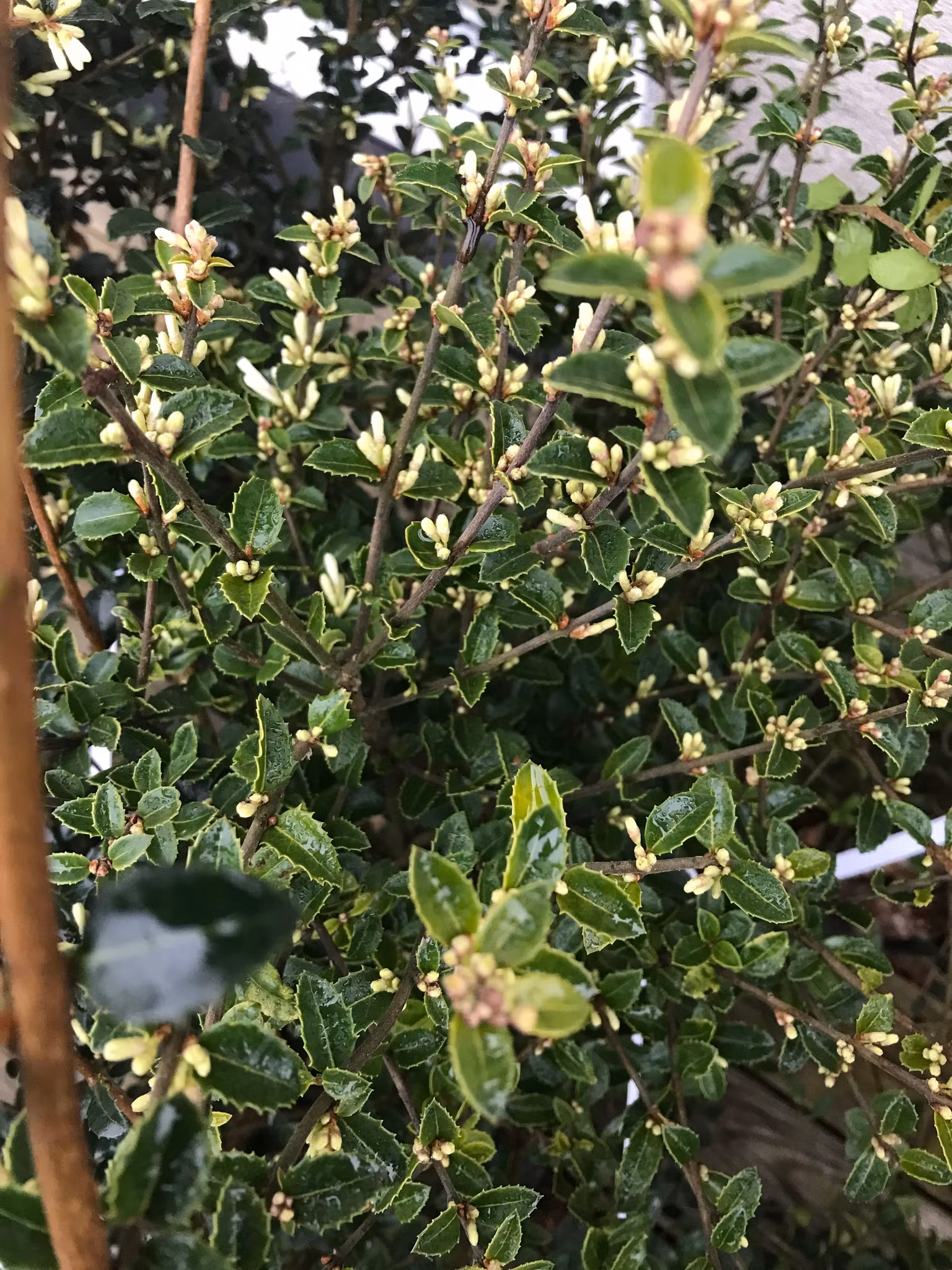 Osmanthus delavayi är en tät , kompakt vintergrön buske med glansiga, mörkgröna, tandade blad. .. Blommar på våren (april) med vita , väldoftande blommor.