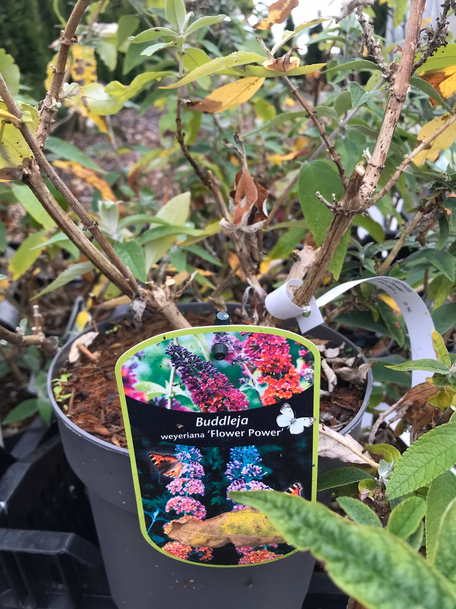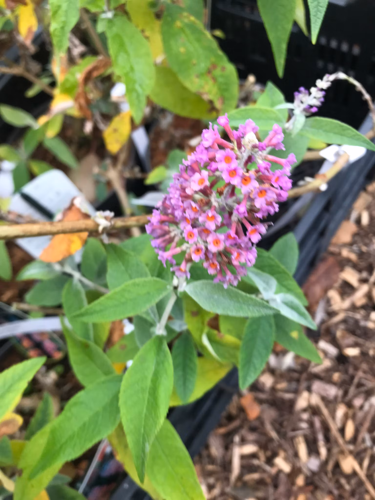 Unik lövfällande fjärilsbuske med lila blomknoppar, som öppnar sig mot vippor bestående av doftande , klotformade klasar av blommor i nyanser av rosa och orange.