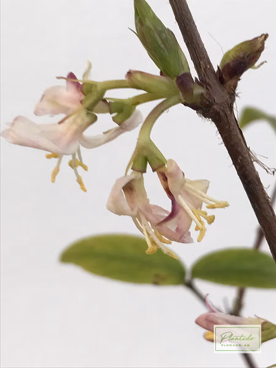 En sällsynt halv vintergrön kaprifol växt som har vackra, doftande, rosa-vita blommor mellan november till mars. Smala lansformade , koppar färgade unga blad blir mörkgröna när de åldras.En kompakt buske, idealisk för att växa mot en solig vägg eller staket. Höjd 2m bredd 1-1,5m