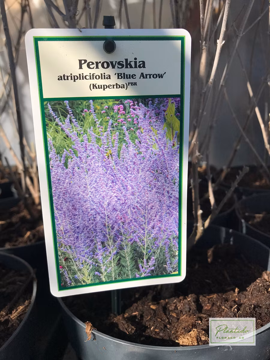 Vacker lättodlad upprättväxande halvbuske med kraftig tillväxt. Denna nya sort är en klar förbättring av "Blue Spire", som är ganska olika. Blommorna hos Blue Arrow är lilablå i höga luftiga spiror, bladen och grenarna är grågröna och starkt doftande. . Trivs väldränerad torr kalkrika sandjord i soligt läge. Blomningstid från juli till september. Blommorna magnetiserar fjärilar och andra nyttiga insekter. H. 100 cm B. 40cm . Beskär 10-15 cm över marknivå på våren.