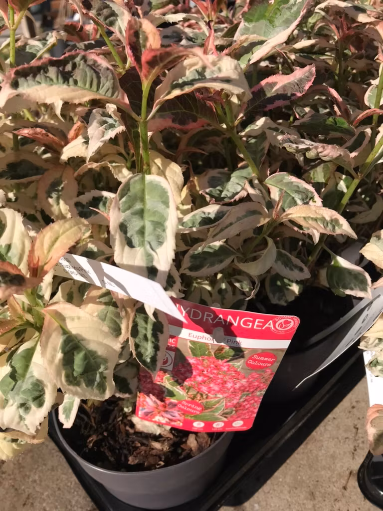 Mycket vacker hortensia med unikt bladfärg. Bladverket är trefärgade , exceptionellt – stänk av silvergrönt omgivet av en djärv vit kant och böljande med rosa nyanser på våren. När de rosa nyanserna bleknar ut, springer spetsliknande blommor ut ur ljusrosa knoppar. Bladverkets svala toner skapar en perfekt bakgrund för de tvåfärgade, rubinröda blommorna, som är rodnande med blekt mitt. Denna yviga, kompakta växt passar perfekt i rabatter eller stora krukor. Dess bladverk ger en förlängd färgsäsong från det ögonblick då bladen kommer fram på våren, genom försommaren när blomningen börjar, ända fram till september. Höjd och bredd runt 60-100 cm.