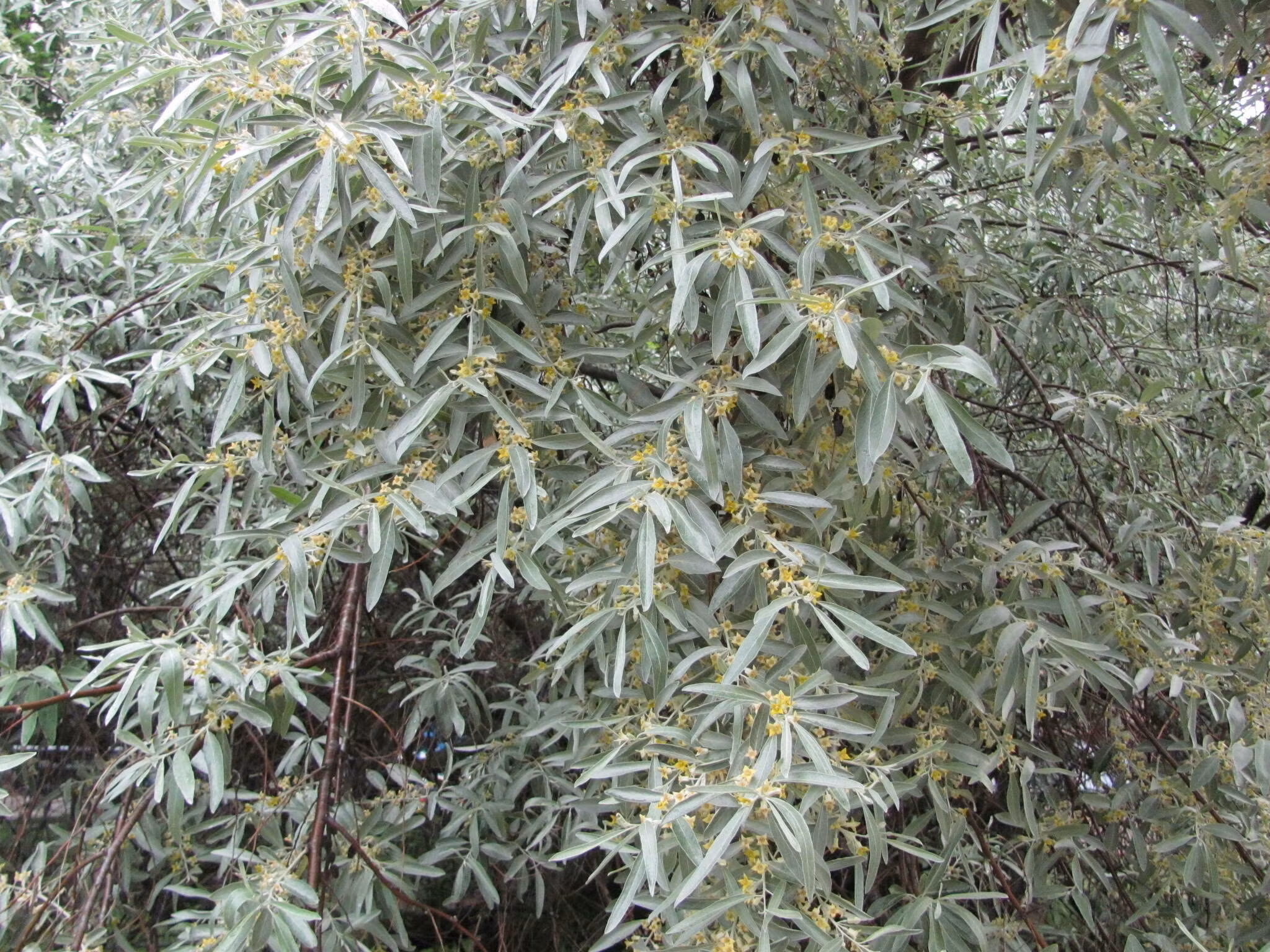Flerstammig lövfällande buske eller träd med oregelbundet växtsätt. Bladen är smala silverfärgade på ovan och silvervit på undersida. Blommar med gula mycket starkdoftande blommor på maj följs av små, ätliga, olivliknande stenfrukter på hösten. Växten tål dålig jord, vind, salt och industrimiljö. Trivs i väldränerad jord i soligt eller halv skuggigt läge.
