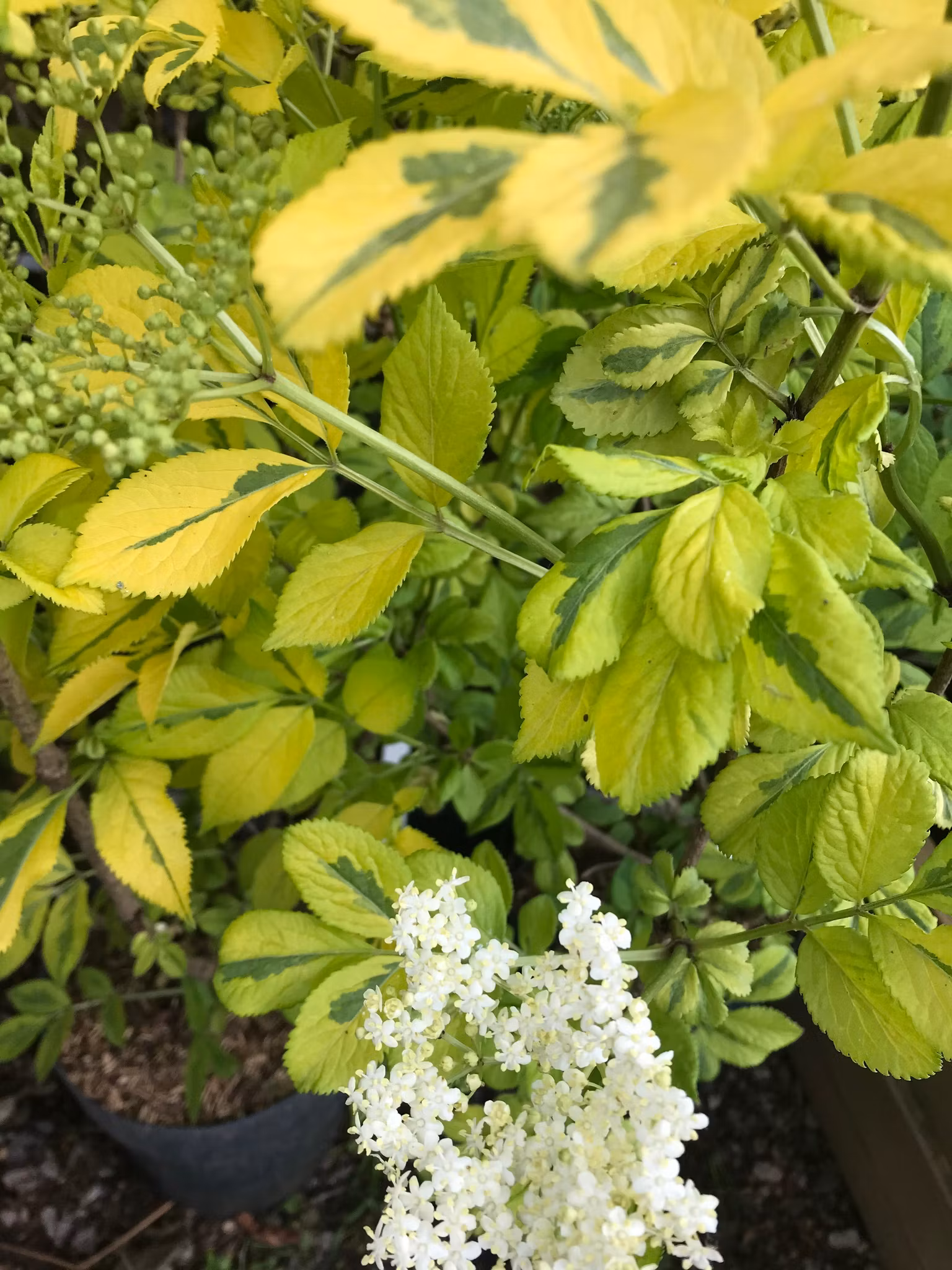 Madonna har vackra gulgrönt brokiga bladverk. Blommar med vita blommor under sommaren som följs av svarta bär på hösten. Både blommor och bär är ätliga.