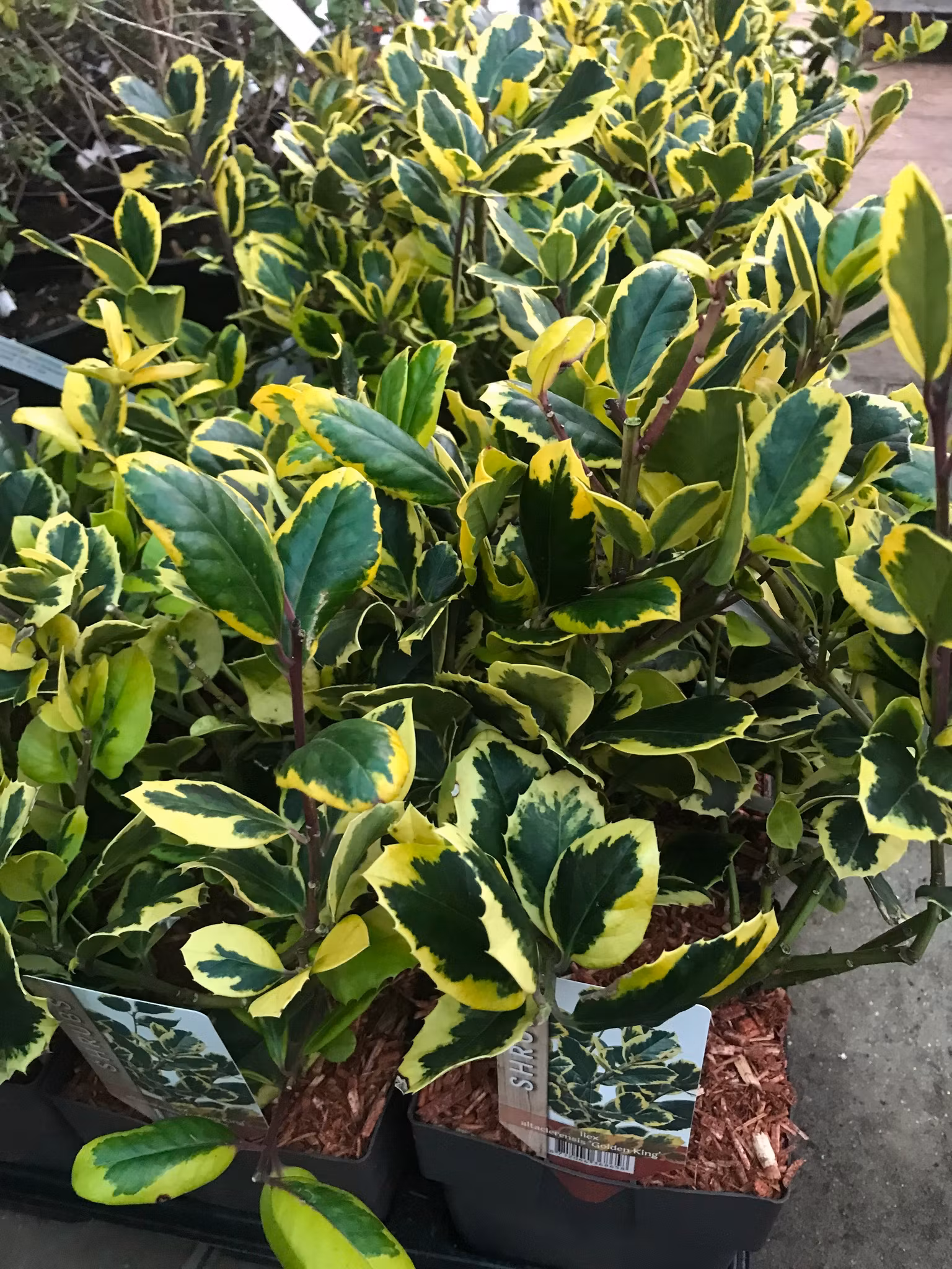 Golden King är en är städsegrön mycket dekorativ mindre buske eller litet träd med iögonfallande brokiga, läderartade, glansiga, blad . Sluthöjd 1-3m.Blommar riklig i maj med små, vita oansenliga blommor som magnetiserar nyttiga insekter. Kan följa dekorativa, ljusröda bär som sitter kvar länge på busken. Sorten är en honklon och behöver en hanklon i närheten för att bilda bär.Fungerar vilken storbladig hanjärneksart som helst. Till exempel Ilex aquifolium, Ilex altaclerensis, Ilex koehneana. Trivs i väldränerad , lätt sur jord i halv skuggigt , skuggigt läge. Vi har passande han planta Ilex aquifolium `Ingamiii`.