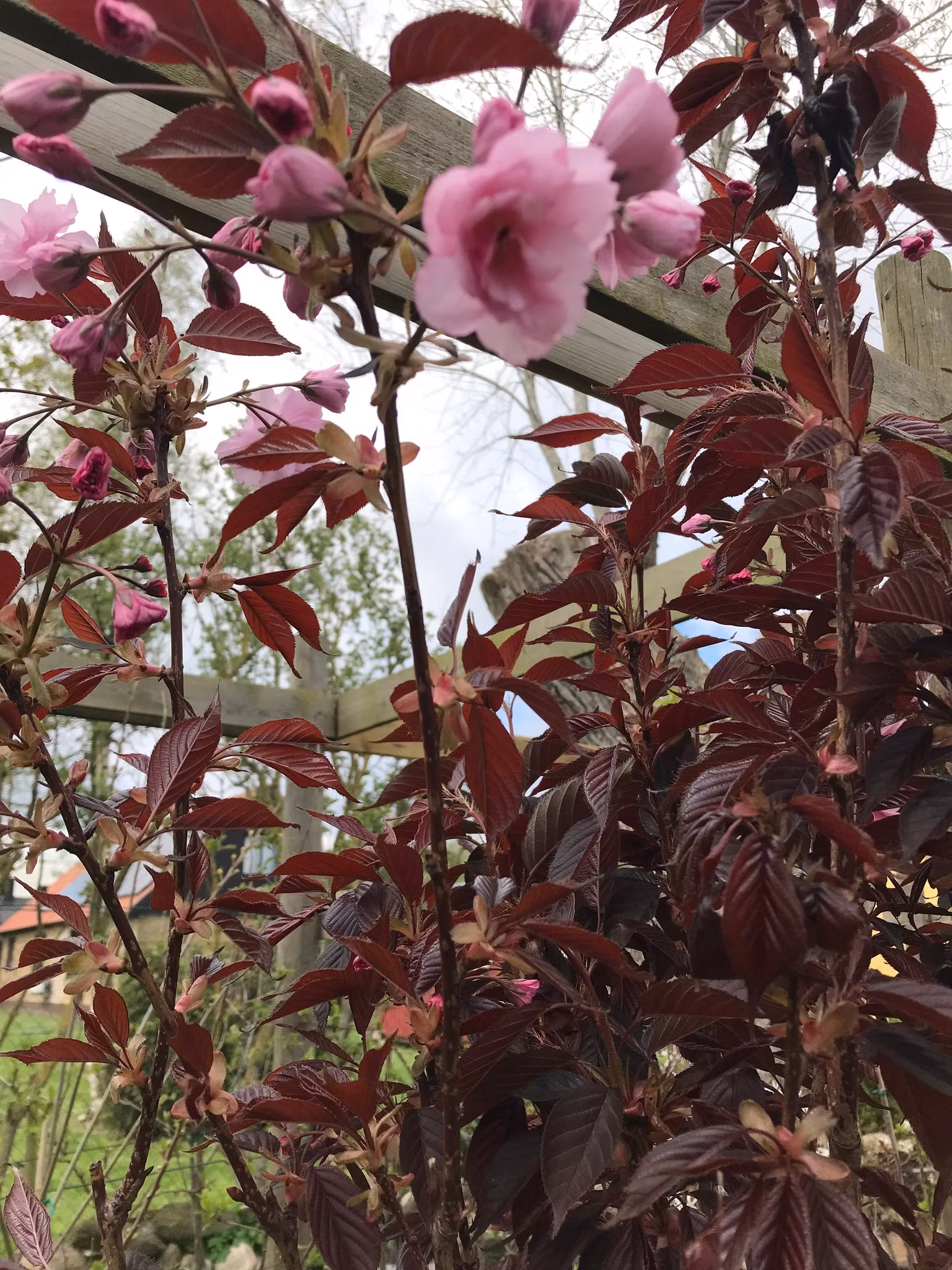 Vackert mindre träd med vasformiga växtsätt. Blommar på våren med rosa , fyllda blommor som skapar en kontrast med bladverket som är mörkt purpurfärgade. Trivs i väldränerade jord i soligt eller halv skuggigt läge. Sluthöjd:4-6m