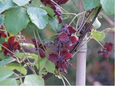 Akebia Amethyst Glow är kraftigväxande halv vintergrön klättrare med rundade blad. Blommar med kryddig , vaniljdoftande , blekrosa blommor med rödlila mitt. Följs ibland ätliga frukter. Trivs i väldränerad, fuktighets behållande jord i full sol.