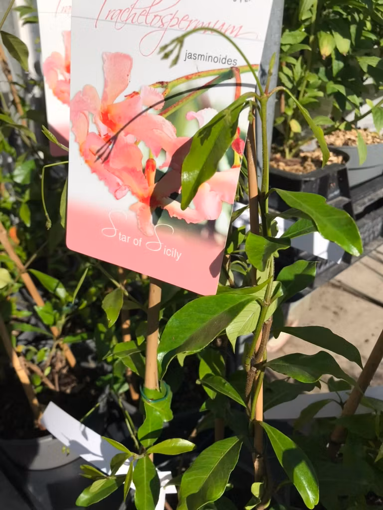 Stjärnjasmin är en fantastisk vintergrön snabbväxande klätterväxt, har frodiga mörkgröna glänsande blad och massor av blekgula mycket doftande blommor. En snabbväxande klättrare som sprider sig snabbt åt alla håll,. Bladen skiftar till brons-lila till brons-röda under vinter. Star of Sicily blommar med rosa blommor.