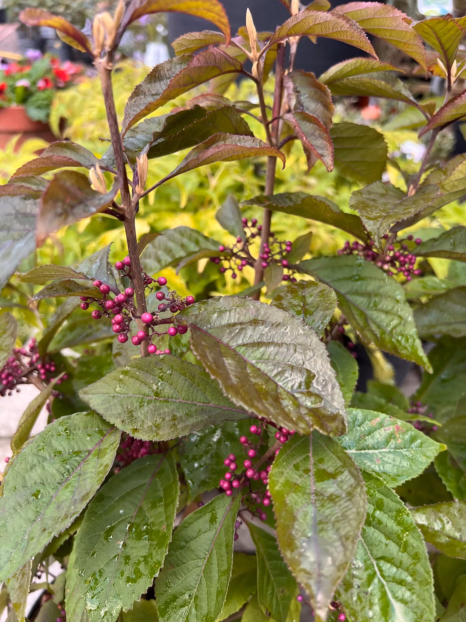 Vacker lövfällande buske som blommar med små stjärnformade lila-rosa blommor på sommaren föls av stora klasar av violetta pärlliknande bär på hösten och under vintern. Det unga bladverket är ofta bronslila och blir mörkgrönt på sommaren innan det blir gyllenlila på hösten. Trivs i svagt sur jord i soligt skyddat läge.